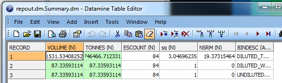- VOLUME: the overall volume that corresponds to the stope shape representing the BINDESC field, where the BINDESC field is either: