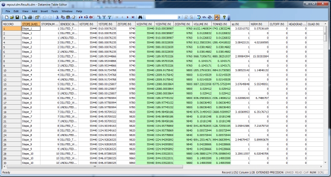The Concise Report and Detailed Report options can be used to show summary/detailed statistics in the form of a Datamine file.