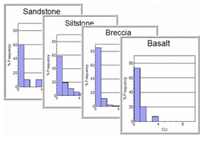 The Histogram dialog offers the choice of creating multiple individual charts (representing multiple data subsets) or a single, compound chart showing all results in one view. A compound chart will, by definition, always be a single 'page', however, multiple charts are handled by a single chart 'object' in memory using independently accessible pages. For example, if the Individual Charts option is selected in the Histogram dialog, and the Value and Key fields that have been selected give rise to four separate charts (for example, if one CU Value Field is selected, and one LITH Key Field containing four unique values), these charts will be created separately, and can be accessed individually using the Charts tab.