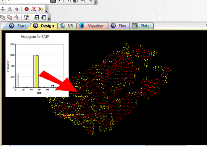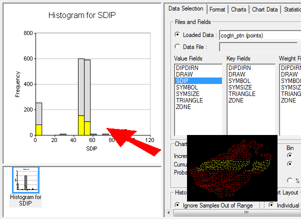 For example, the following points file has been used to generate a simple normal distribution histogram showing the unique SDIP directions for each point (this file was produced using Studio's COGTRI process) - an inset view of the selected histogram bar has been transposed onto the image: