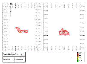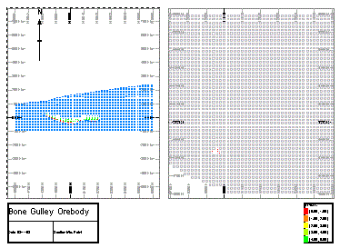 For example, in the following plot sheet, a block model file has been loaded into memory. The model is displayed in two projections; the right hand projection shows a top-down view of the model cells at a scale of 1:1000, and the left hand projection shows a North-South section through the orebody: