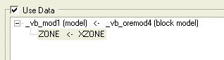 Note how the ZONE field is mapped to [absent]. This is because no ZONE field can be found in the mapped model (it has an XZONE field instead). Selecting the "ZONE  <- (absent)" line transforms the right hand list to show all data columns belonging to the mapped object (in this case _vb_oremod4 (block model)). To map the ZONE template field to the XZONE object field, select [XZONE] in the right hand list. This updates the mapping on the left: