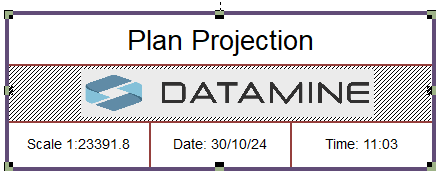 Like many plot items, a title box 'belongs' to a parent object. At the top level, this could be the plot sheet itself. In this situation, the default layout of the title box includes cells to display the application name, the current date and time. If a title box is created within a projection, it will show the projection name, the current section number (if appropriate), the scale, date and time. This is similar to the example above, although the section cell contents has been replaced with clip art.