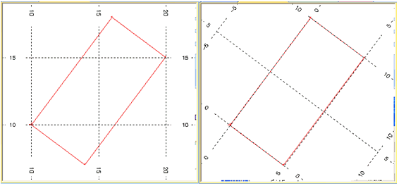 The graphic above shows the results of the rotation. The red rectangle on the left is from the DATA1 file and is rotated by 36.87 degrees relative to the world coordinate system and has one of its corners at 10,10,0. If you then define a rotation of 36.87 degrees around the Z axis and define the new local origin as 0,0,0 as in the macro above, you get the new coordinate system as shown in the right side graphic. Output file DATA2 contains the coordinates in the new system. Remember that it is always the axes that are rotated, not the data.