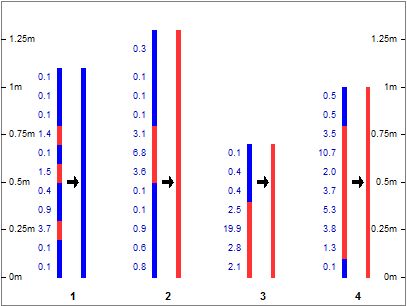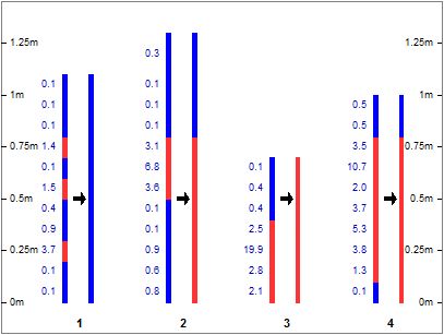 The following image shows pairs of face sample lines that have been processed using COMPSE, using the above parameters. In each displayed pair, the original samples are situated on the left, coloured red (>1.2g/t) or blue (<1.2g/t); the COMPSE processed samples are on the right, coloured using the same legend. Looking at the output COMPSE results: