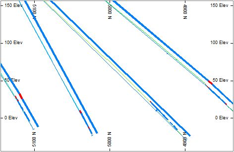 In the following example, the drillholes have been coloured using a 3.25 AU grade cutoff and composited using a minimum mining width of 5m and a cutoff of 3.25. The output composites are shown, for Section 6062 E, to the right of each drillhole: