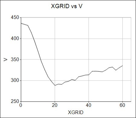 You can plot XGRID on the X axis against V on the Y axis of a line chart. It can be seen from the graphic that the decluster weighted mean grade (V) decreases until the X grid size reaches 20m and then starts to increase. This shows that the optimum grid size is 20m in X. In this example XFACTOR and YFACTOR are both 1 so the corresponding grid sizes in Y and Z also 20m.