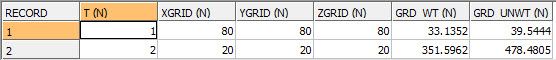 This output Summary file contains one record for each zone combination. This includes the optimum declustered grid size, the decluster weighted mean grade (GRD_WT) and the unweighted mean grade (GRD_UNWT). In the example below the *ZONE1 field is T.