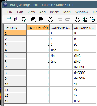 A SETTINGS file determines how the incoming data attribute names are mapped to output names. In this case, you may want the cell size attributes (Xinc, Yinc, Zinc) to be capitalized in the DM file, and to ensure the expected system fields for a block model are present, convert X to XC, Y to YC and Z to ZC. In this case, the SETTINGS file looks like this: