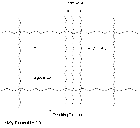 When a slice is terminated the average value of all numeric fields within the slice is calculated. For alpha fields, the major value is calculated. This is the value which has the largest tonnage within the slice. Alpha fields which are blank (absent data) are not included in the calculation of the major field value.