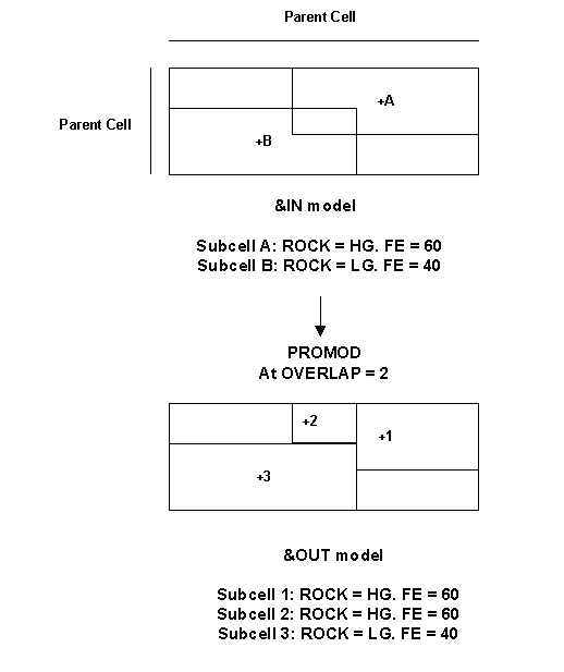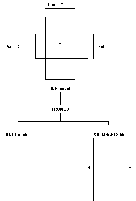 Any overlapping subcells will be resolved by splitting into more subcells as appropriate (see Figure 2). This is the same logic used by the ADDMOD process when combining two overlapping subcells from two separate models. Where the two overlapping subcells in PROMOD have a different value for the same field, the one which occurs second in the &IN model file takes precedence.