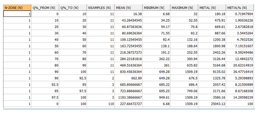 If a WEIGHT field has been specified then the mean grade is a weighted mean and the metal content is the sum of weight*grade. Also the values in the NSAMPLES (Number of Samples) column are not necessarily equal because the weights, not the number of samples, are equally distributed between the quantiles. The WEIGHT field applies to both the Point and Group analysis tables.