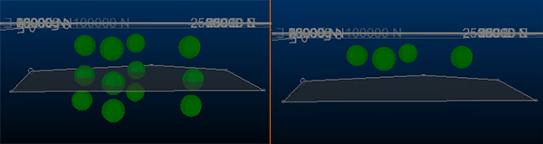 For example, in the image below on the left, a simple DTM (transparent) has 4 coincident points, 4 above and 4 below the surface. If SELECT=1, TOLERANC=0.001 and EXCLUDE = 0, the points on the right are in the OUT file when SELWF is run: