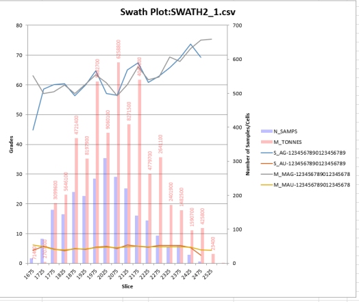 The two output plot data tables have the same content but it is stored in a different structure in each file. SWATH1 is suitable for graphing in Studio's plot window, as in the image below. The X Axis should be the X, Y or Z Slice, the Y axis should be GRADE and the Key Field to use is VARIABLE.