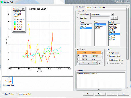 Up to 10 fields from the model file can be specified for graphing. The fields *GRADE1 to *GRADE10 must occur in the input model file. If a specified model field also exists in the input sample file that will also automatically be used for graphing. The fields *SGRADE1 to *SGRADE10 can be used to specify numeric fields that exist in the input sample file but not the model file. If a field exists in both the input model and sample files it only needs to be specified once.