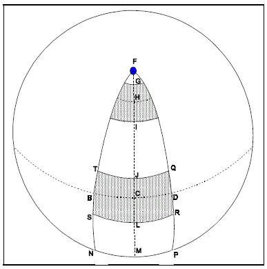 Points B, C, and D all have zero dip, and so the broken line BCD lies on the equator. The broken line FM is a line of longitude (azimuth a), with point F being the North Pole. If point O (not shown in the diagram) is at the centre of the sphere then line OC is the vector of a variogram with zero dip and azimuth a. The lines of longitude FTBSN and FQDRP are the limits of the horizontal angle of regularization around OC. The lines of latitude TJQ and SLR are the upper and lower limits of the vertical angle of regularization.