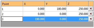The table below now contains 3 rows (one for each digitized point). The values for X, Y and Z are all currently zero. This is because none of the digitized points have been 'assigned' to a point in 3D space yet. As the coordinates are known (they are on the chart), you will need to enter them into the table below, manually.