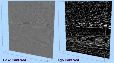 Contrast: if a 'hybrid' model format is being viewed, such as that used to visualize seismic data, an additional Contrast slider is available to allow you to increase or decrease the contrast between colored areas displayed according to a 'fast legend'. For example, the image below shows a section through imported seismic data at different contrast settings: