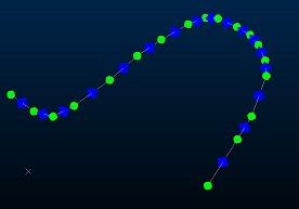 As with other Symbols screens, you can define one or more configurations. Multiple configurations permit the display of multiple symbol groups on the target data. All formatting options relate to the currently selected symbol group only. So, for example, you want a string to have a green circle symbol at each vertex position, but a blue diamond at the centre position of each edge, pointing along the line like this: