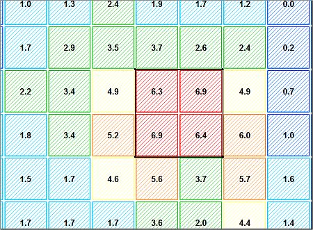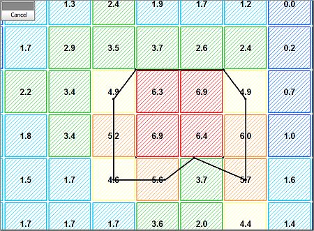 Note: Additional adjustment steps are still possible as not all block model cells that fall above the cut-off have been reached yet, using the defined step size. Using an outline with additional string vertices and using a different step size will yields slightly different results.