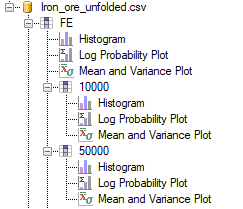 The image below shows a basic component hierarchy in the Project Tree. In this tree, the 10000 and 50000 components are both children (child components) of FE, which is their parent component. The Iron_Ore_Unfolded.csv data component is the parent of FE and the grandparent of 10000 and 50000.