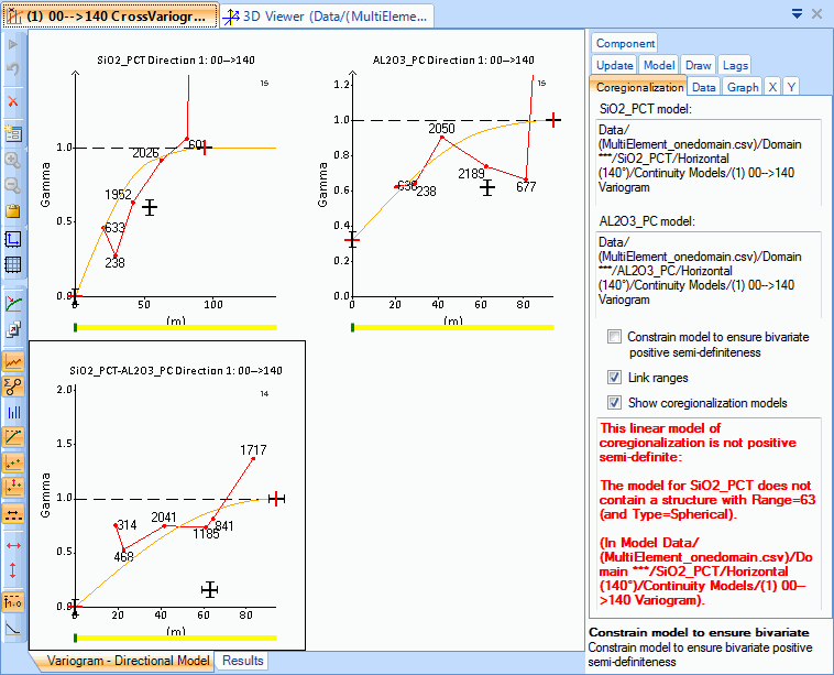 1. The cross-variogram model must be made up only of structures that exist in both the specified univariate variogram models. For example, if both univariate models are made up of a nugget and a spherical structure, with given sills and ranges, the cross-variogram model may contain only a nugget and spherical structure with the same range. If this condition is not met, it is reported on the Coregionalization tab as shown above.